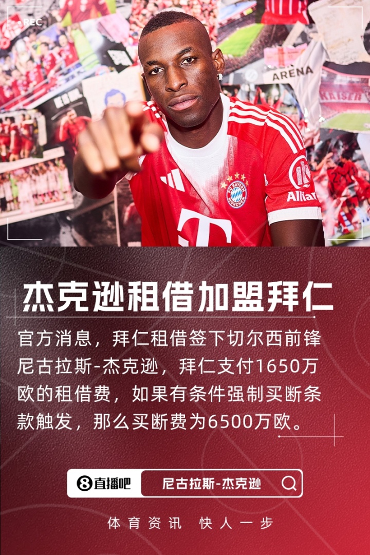 直线交易!官方:杰克逊租借拜仁达成,租借费1650万欧+6500万买断条款